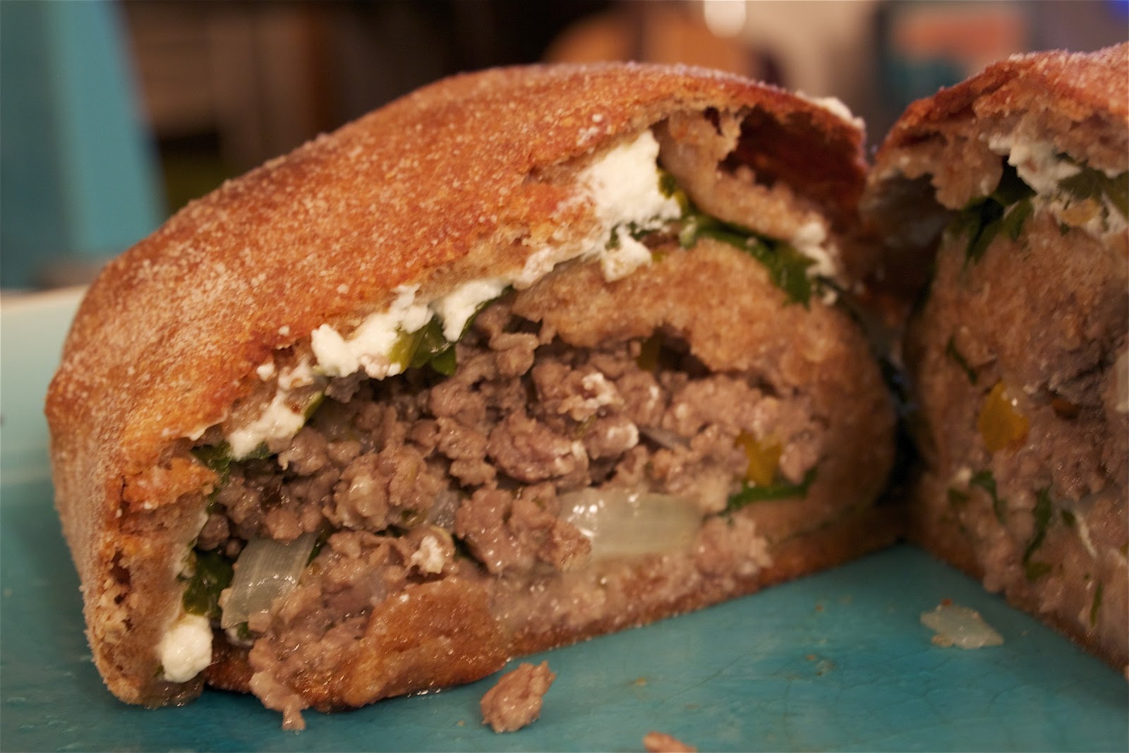 I cooked up some grass-fed beef and chopped onions. While that was in the pan, I divided the pizza dough in half and rolled each half out into a rectangular shape.