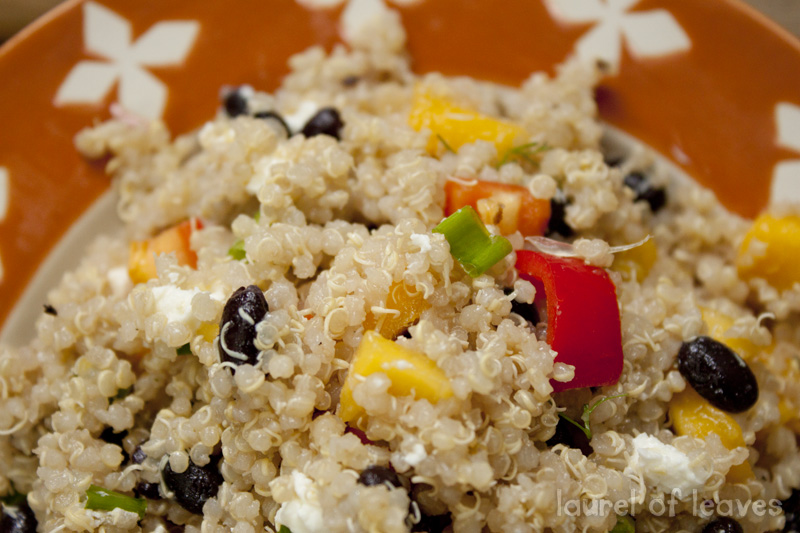 2 c. cooked quinoa, at room temperature or chilled (cook it in vegetable or chicken broth for the best flavor!) 1 1/2 c. cooked black beans 1 medium mango, peeled & diced 1 red bell pepper, diced 4 green onions, thinly sliced 1/2 c. chopped fresh cilantro 4 Tbsp. red wine vinegar 3 Tbsp. olive oil 1-2 Tbsp. fresh lime juice sea salt & black pepper to taste 3-5 oz. goat cheese, crumbledDirections: